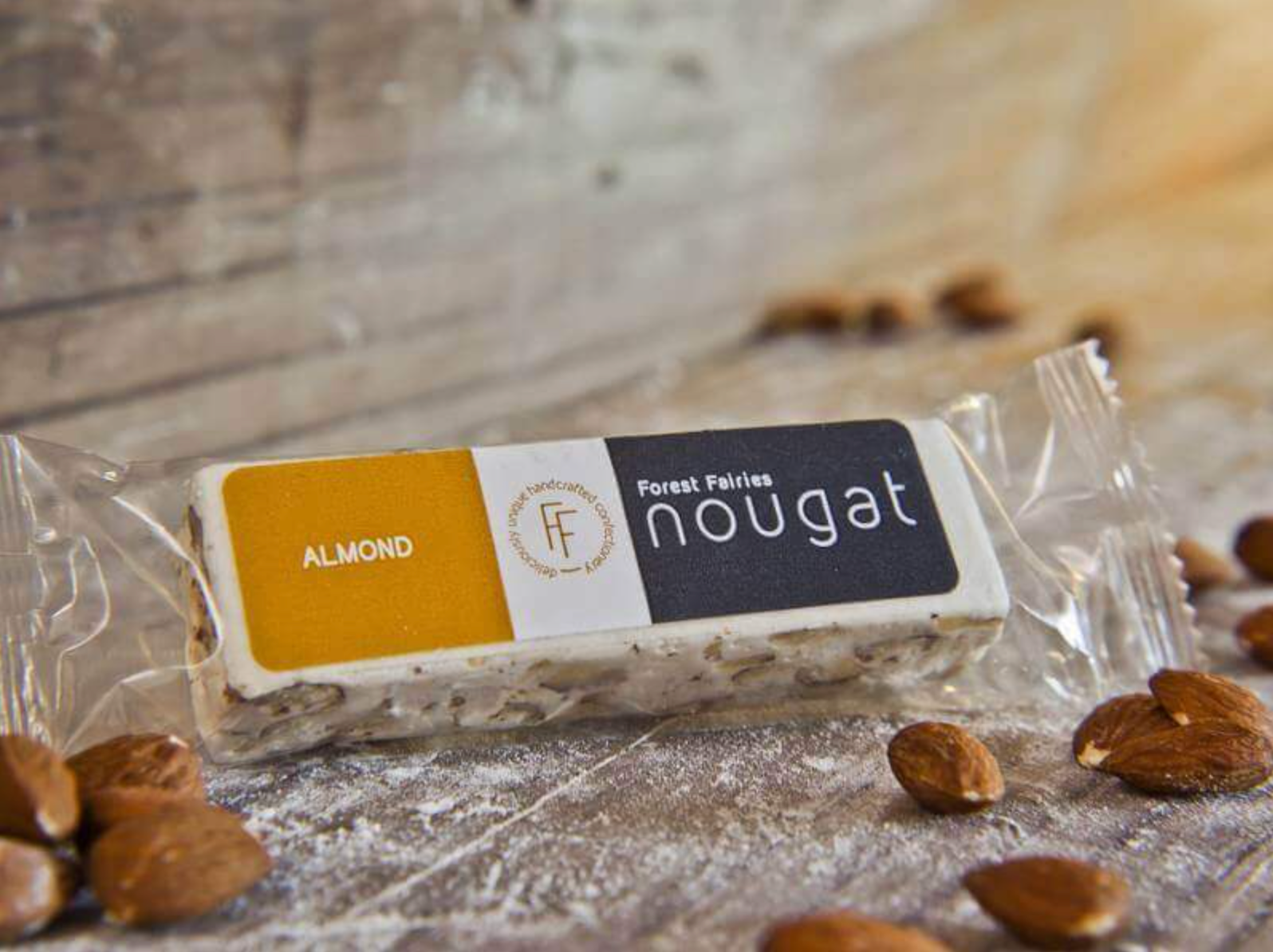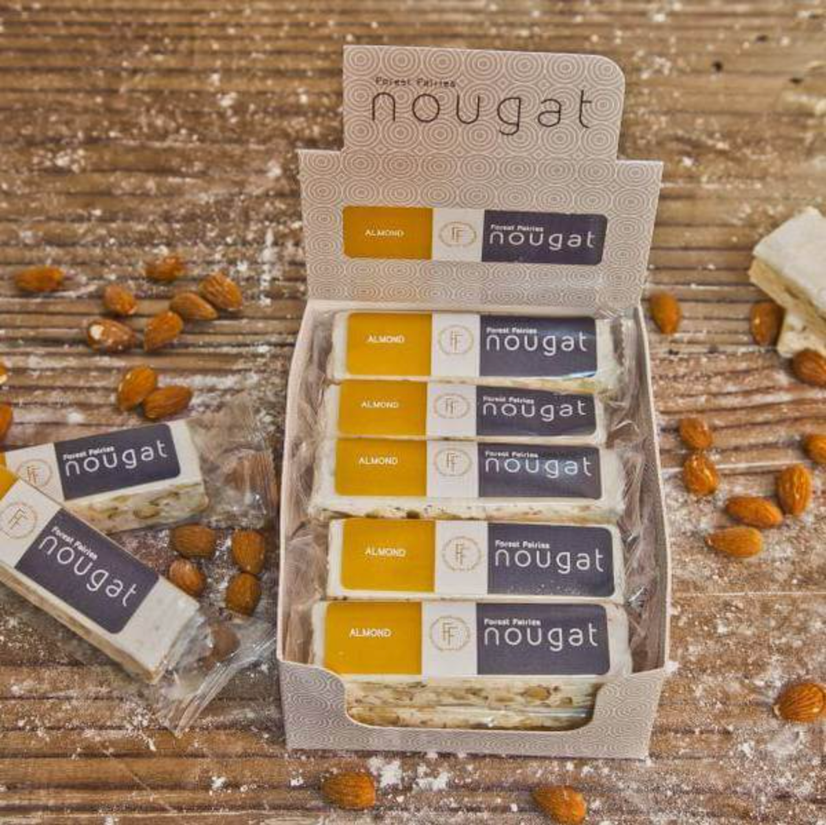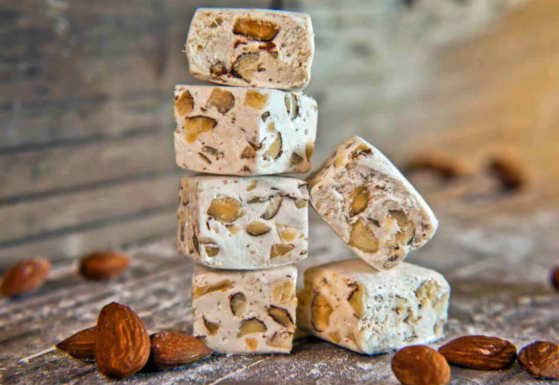 Tender nougat generously studded with roasted almonds. Lightly sweet, nut-forward, and timeless.