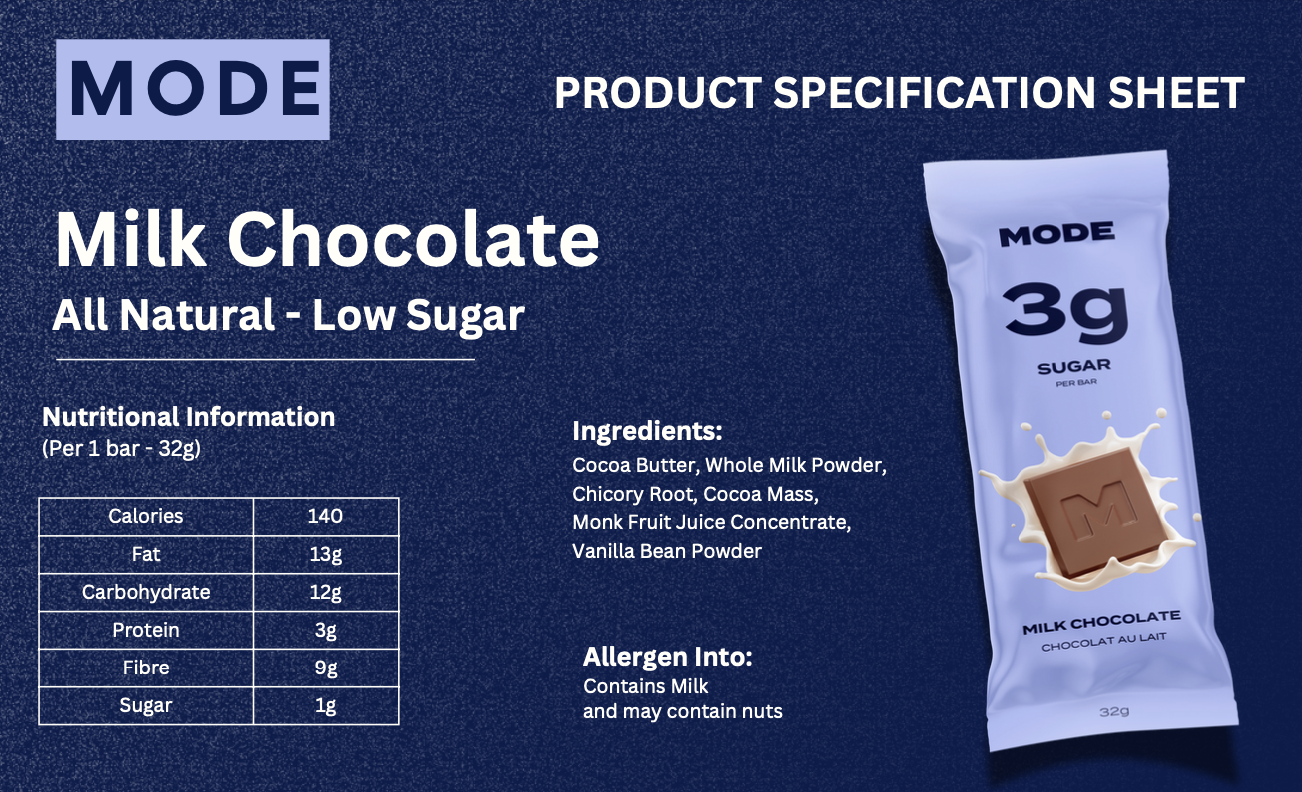 Shop a Canadian chocolate company that allows you to indulge without the guilt! MODE has created a delicious chocolate bar without all the extra sugar, cut out the hard-to-pronounce additives, and used only the highest quality ingredients. Now you can have your chocolate and eat it too.